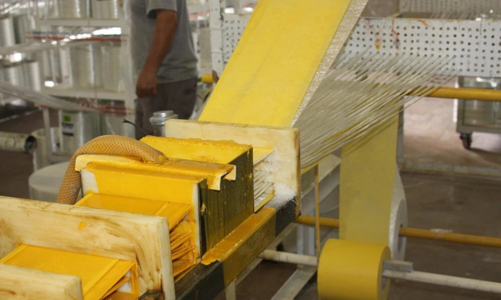 Em seguida, esse material é puxado por sistemas de tração e passa por um molde metálico aquecido, onde ocorre a polimerização da resina.